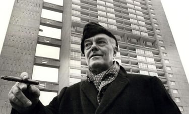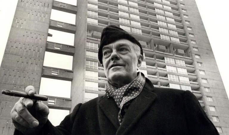 Erno Goldfinger beneath Balfron Tower in Poplar